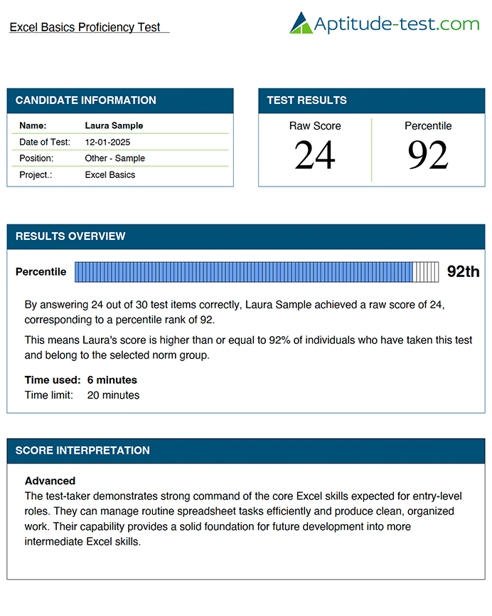 With 30 targeted questions delivered over a 20-minute time limit, the assessment measures practical, job-relevant Excel skills to help you identify candidates who can organize information, perform basic calculations, and manage spreadsheets accurately and efficiently.